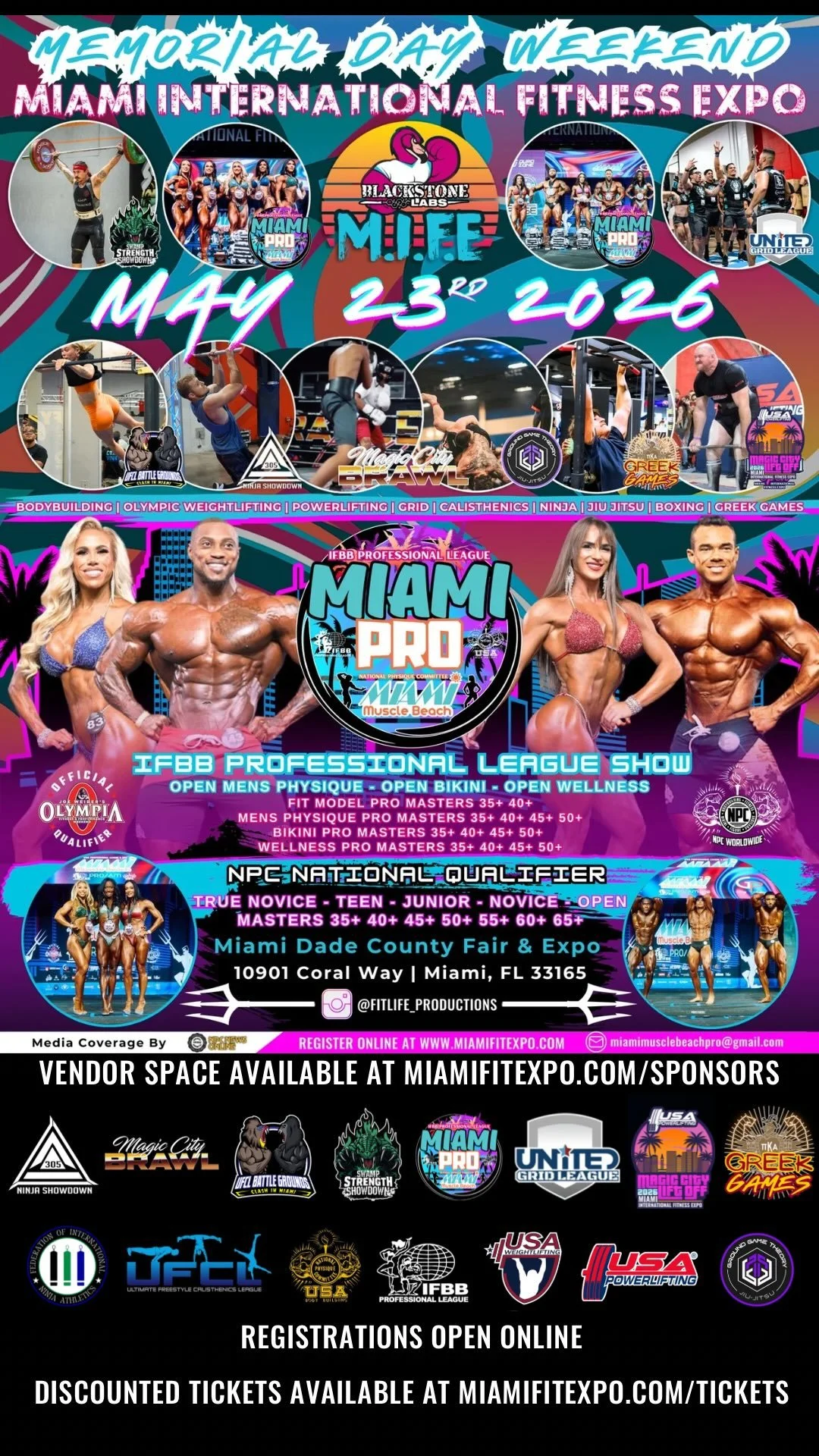 The Miami International Fitness Expo (M.I.F.E) is home OF the IFBB Miami Pro, an International Federation of Body Builders (IFBB) Pro Olympia Qualifier, and NPC Miami Muscle Beach, a National Physique Committee (NPC) National Qualifier. The M.I.F.E is also host to the 305 Ninja Showdown (FINA), BATTLEGROUNDS: Clash In Miami in Calisthenics (UFCL), the MIAMI OPEN by USA powerlifting, a jiu jitsu invitational by ground game theory, THE UNITED GRID LEAGUE, THE MAGIC CITY BRAWL BY BRAWLERZ BOX, THE GREEK GAMES HOSTED BY FIU PIKE & the SWAMP STRENGTH SHOWDOWN (uSAW) IN OLYMPIC WEIGHTLIFTING PLUS more!